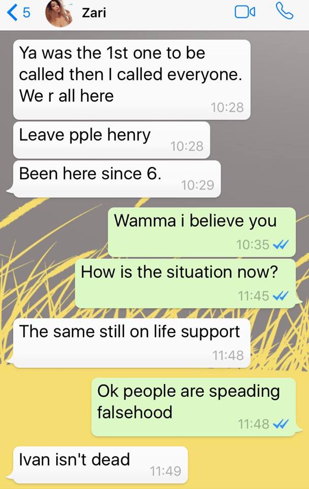 In a screenshot of a conversation that has surfaced online, the socialite has been seen rubbishing the rumors but saying that his condition was bad as he was still on life support.
