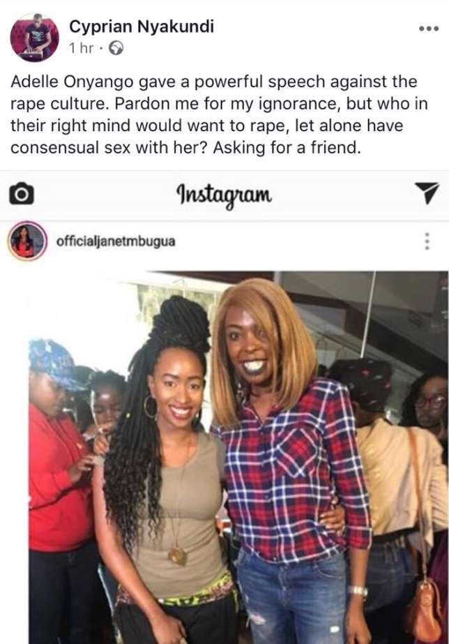 Adelle went on Facebook and hit back at Nyakundi for turning her post that was meant to oust rape culture into one of instigating rape and women objectification.