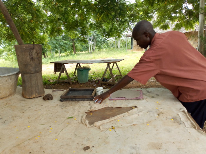 The process of making the paper is simple and requires cheap and locally available material such as pestle and mortar, rectangular tables, boiling pots, and wood glue.
