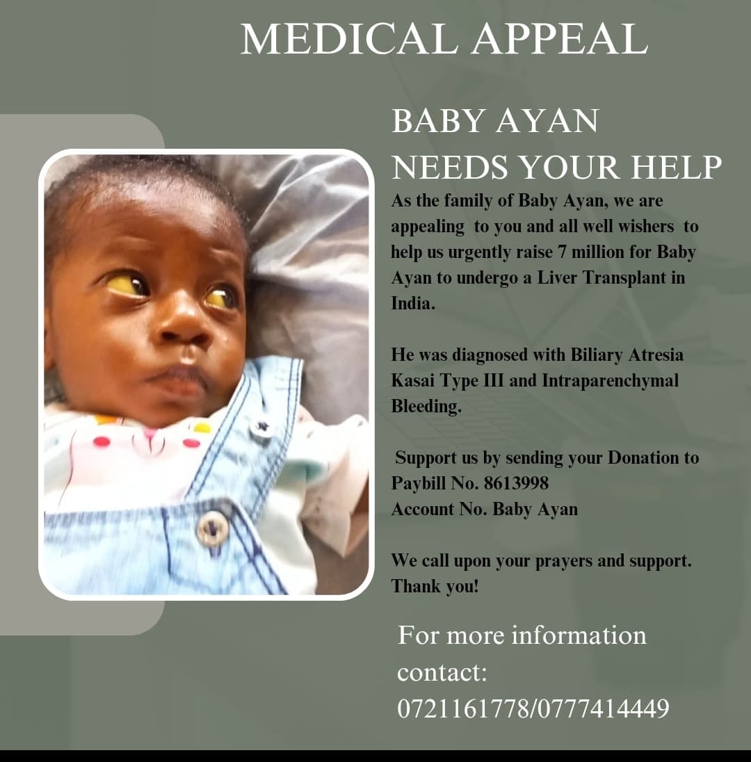 “Baby Ayan was born with a rare liver condition, Biliary Atresia which was diagnosed one month after birth after he had an internal bleeding to the brain. He was admitted and treated at the Coast General teaching and referral Hospital. He had for a corrective surgery (kasai procedure) at 2 months of age which was unsuccessful and now needs an urgent liver transplant,” said the family.